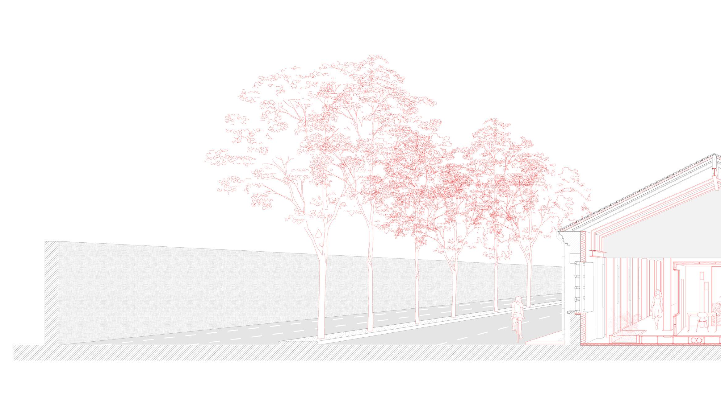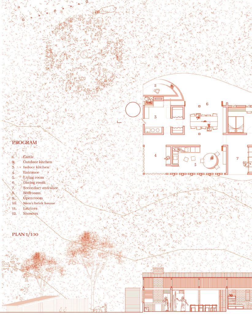 The red thread is represented by the clay wave of the base which raises and lowers, as the tides do, between the living and the bedroom areas. The project is located in the west side of the area, close by Nico’s house, the most sheltered area where the existing trees draw a sort of entrance. There’s no strict hierarchy of passage, the access is fluid in order to let the people be in control of the space.