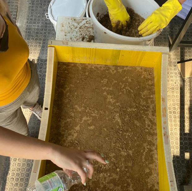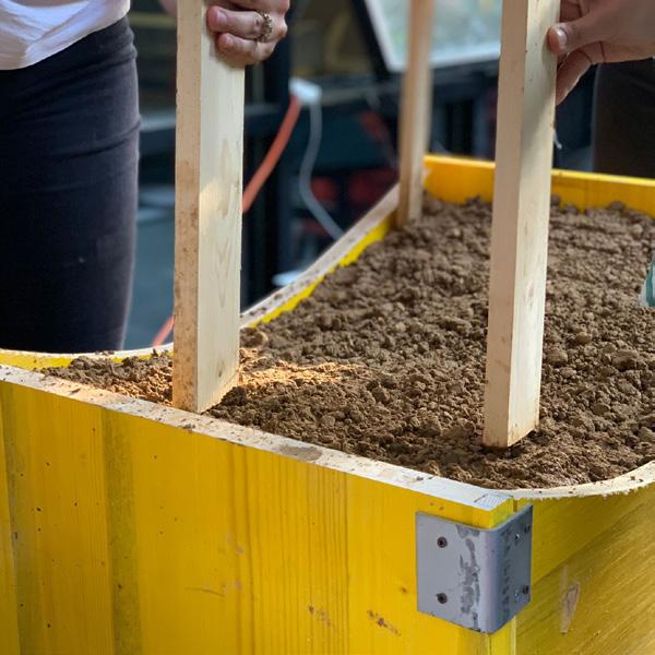 The core then is earth, that will be treated with a technique typical of Africa, that consist in mixing the soil with some wather and pressing the blend. Forming and compression of the earth is shuttering,