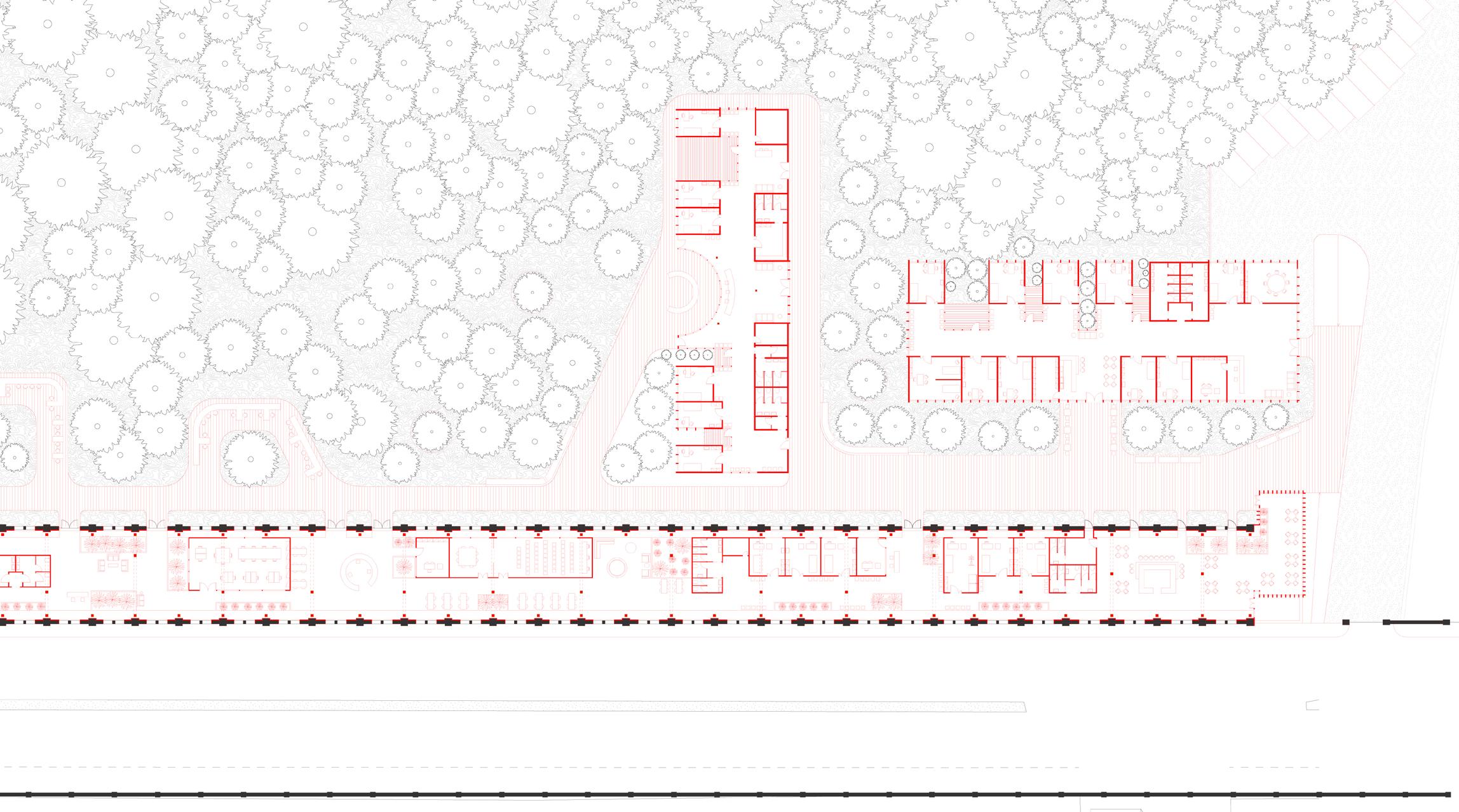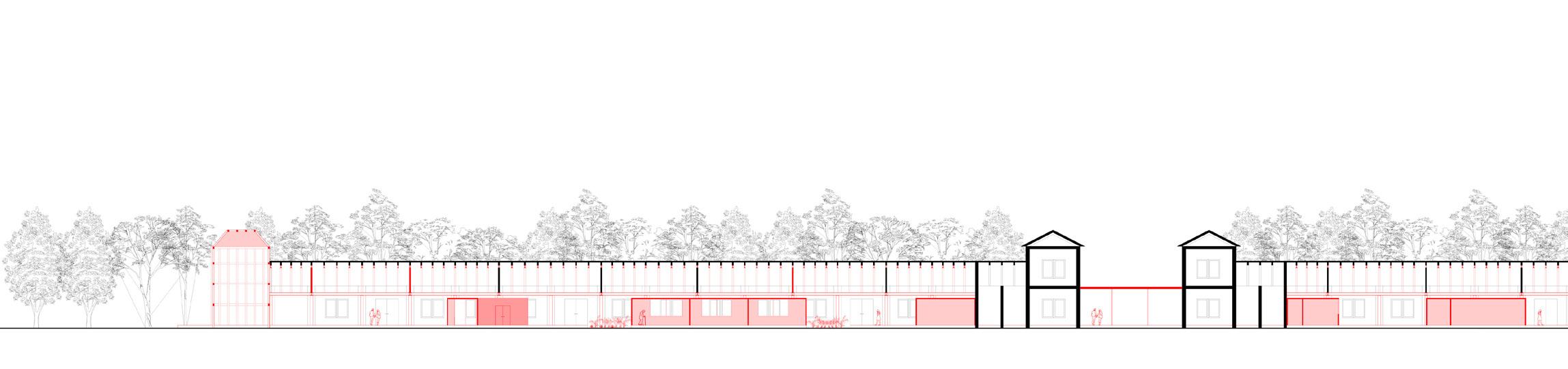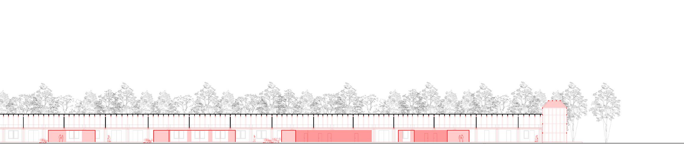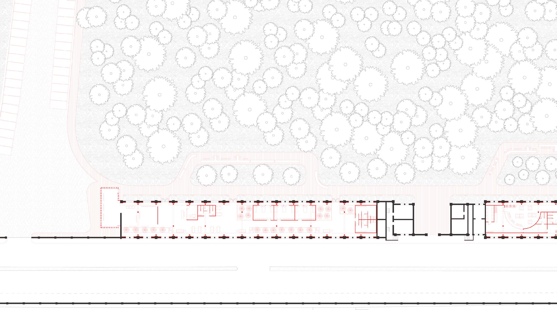 The idea is therefore to open this door to the park to return it to the population. The park will be connected to the city via a cycle path and a wide sidewalk that run straight to the historic center. Beyond these two slats, which will remain unchanged externally, is the path system and shelter that manages the open space of the park and connects the pre-existing structures with the added volumes. It is a path that respects nature to the point that it never touches it: rising and bending every time you meet a tree. The two slats are restored and small functional volumes inserted inside them do not interfere with the original load-bearing structure, but rather enhance it.