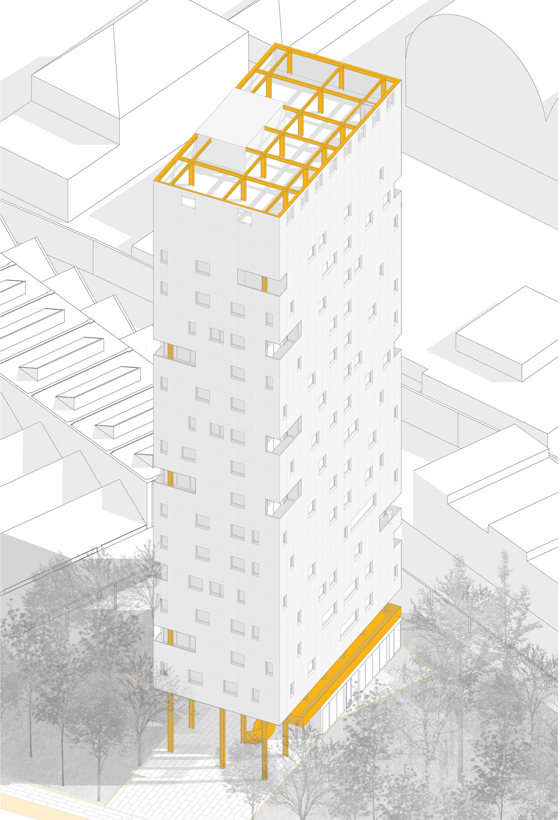 This project was born from the study of emblematic cases of Milanese towers from the 1920s to the 1970s. The first step was to study the proportions of the plants of some cases, such as Torre Velasca or grattacielo Pirelli, identifying an ideal side ratio that oscillates between 0.5 and 0.6. In this case the ratio between the sides, 13.5 m and 25.5 m, is approximately 0.5.