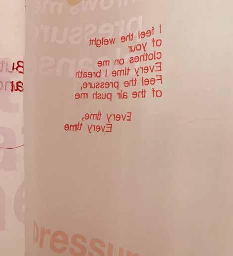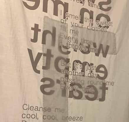 The incep on of the project was using lyrics and music wri en by my sister, Margaret Magalo . The completed installa on incorporated 42 fabric banners throughout the space, screen printed, hand and machine embroidered with lyrics from the song. The music and lyrics were available via a QR-Code at a gallery. All the banners were sprayed with essen al oils giving the work a further dimension.