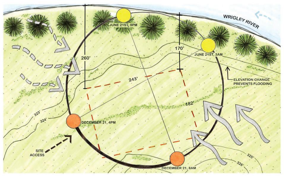 This project involved the research of an ecoregion, and then the selection of a one-acre site. This site would house a self-sustaining outpost where 10 people could thrive. The outpost had to address both the environment and the culture of the region. The ecoregion of this site was the Taiga, and the outpost is in the Northwest Territories of Canada adjacent to the Mackenzie River and Wrigley River. Under the soil, there is a permanent layer of permafrost. The permafrost and the harsh winter climate were the main drivers for the design choices made in this project.