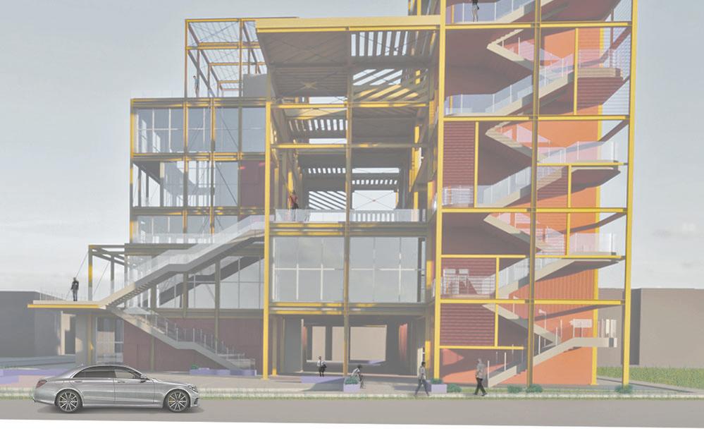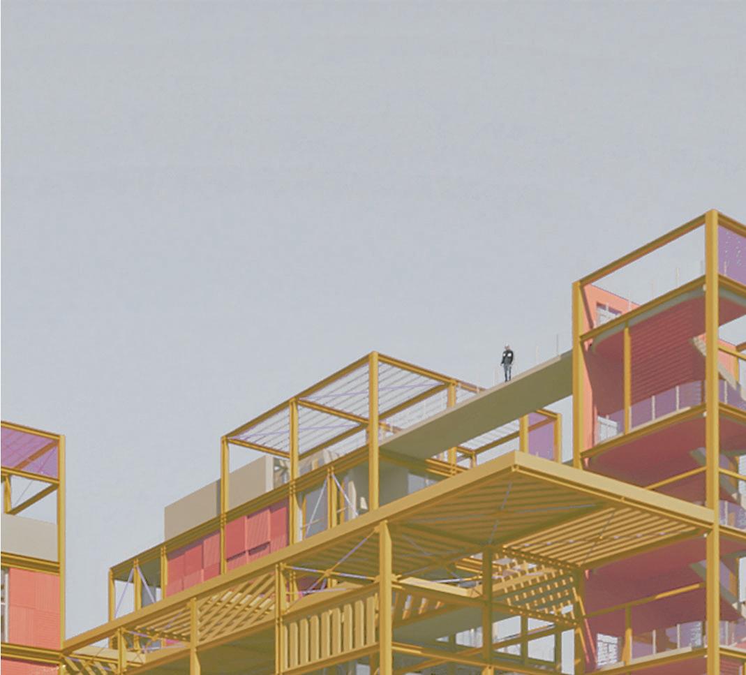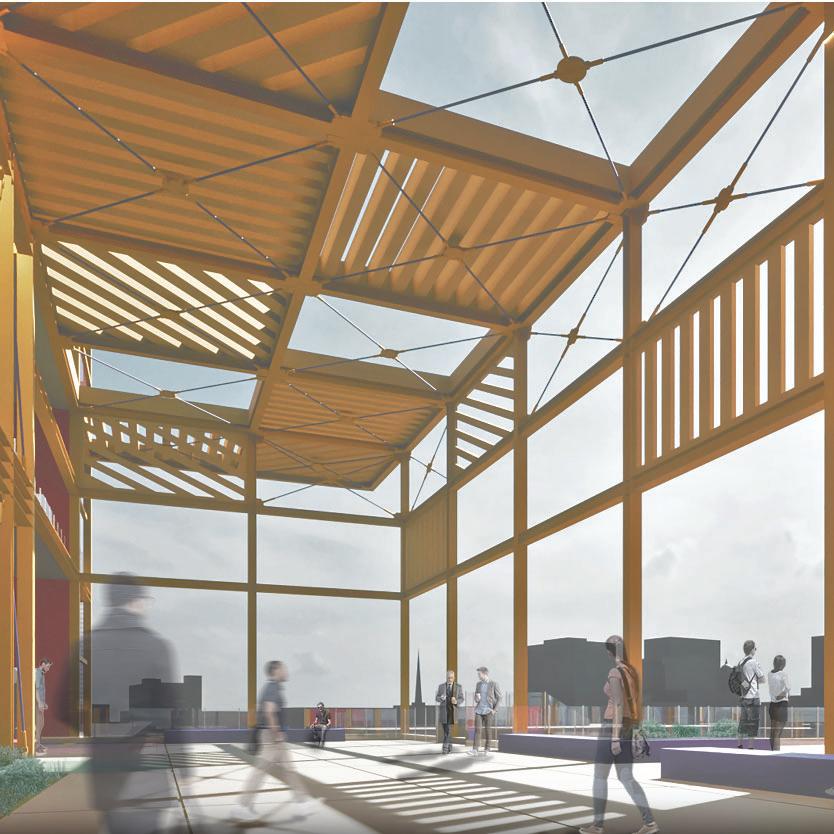This mixed use-development, located directly across from Parkview Field in the heart of downtown Fort Wayne, utilizes a simple grid pattern in both plan and section to generate dynamic spatial compositions while realizing the economies associated with this simple geometry. The program is housed within two towers, connected by a grand trellis. This approach frees a large section of the ground level to serve as a public plaza which provides a space to engage and energize the community through a variety of activities. Activities could include an outdoor marketplace, a place for vendors, lunchtime patrons and a variety of civic activities. In addition, a series of rooftop plazas and outdoor spaces offer a variety of outdoor spaces culminating in a rooftop deck which overlooks the ballpark.