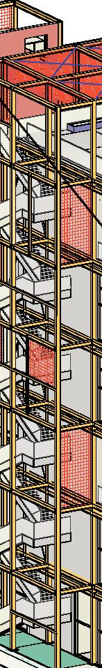 Occupying the prominent northeast corner of the plaza, a set of fire stairs provides a second means of egress from the office tower. This building code requirement is transformed into a prominent architectural feature celebrating the use of steel. The egress stairs also serves as a playful public amenity providing views into the ballpark. A functional requirement of the project is highlighted and celebrated. Bright colors reinforce its uniqueness, creating a true focal point and landmark for the city of Fort Wayne.