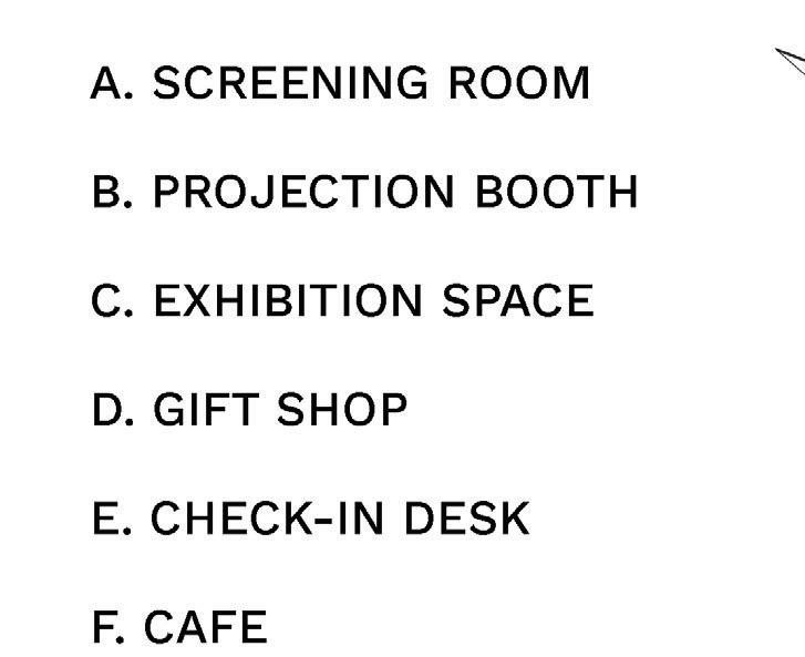 A. Reception B. Conference room (6) C. Bathroom D. Cafeteria E. Therapy F. T-comm closet