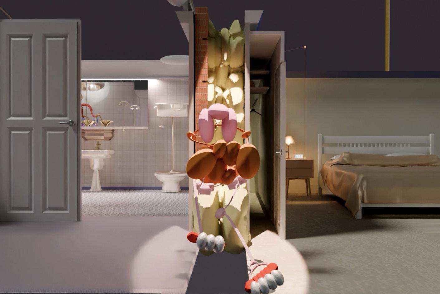 The context here differs from the other two narrations in that it is spatial only as an effect of the romantic feelings, and not the other way around: the kitchen and the bedroom are both receivers, while the Alien morphs her own boudoir. This is why her love is seemingly different than that of a male counterpart through her vulnerability (the inflatable body, her exposed skeleton). However, if we were to consider Nietzsche’s depiction of the more perfect woman as herself being affected by her feminine love, whilst concomitantly stating that the same feeling would turn a man into a slave (The Gay Science, Friedrich Nietzsche, p. 363), we might find that these gendered sentiments bleed into each other. In unpacking this conceptual affective ‘perfection’ that the Alien seems to submit to, I return to de Beauvoir’s separation between the sexes as either immanent, concerned with basic aspects of life, (female) or transcendent, navigating wider dimensions of possibilities (male) (de Beauvoir, 1949, p.20). Regardless of misdirected feminist intent, which in this form is anachronistic to progressive gender study pylons such as J. Butler and M. Nelson, de Beauvoir answers the Nietzschean dispute plainly: men preoccupy themselves with such an externalized social existence that by submission to another they could not hold onto their sense of self. Spatially, this translates to the Alien’s frenzy where the lover morphs for her, as she becomes witness to feminine love herself. Both members of the couple respond to the other’s yearning by becoming the more perfect woman. In similar tonality to finding comfort in the familiar, once she eases in the welcoming shift of the apartment and loses the anxious need to hide, she faces death of her infatuation.
