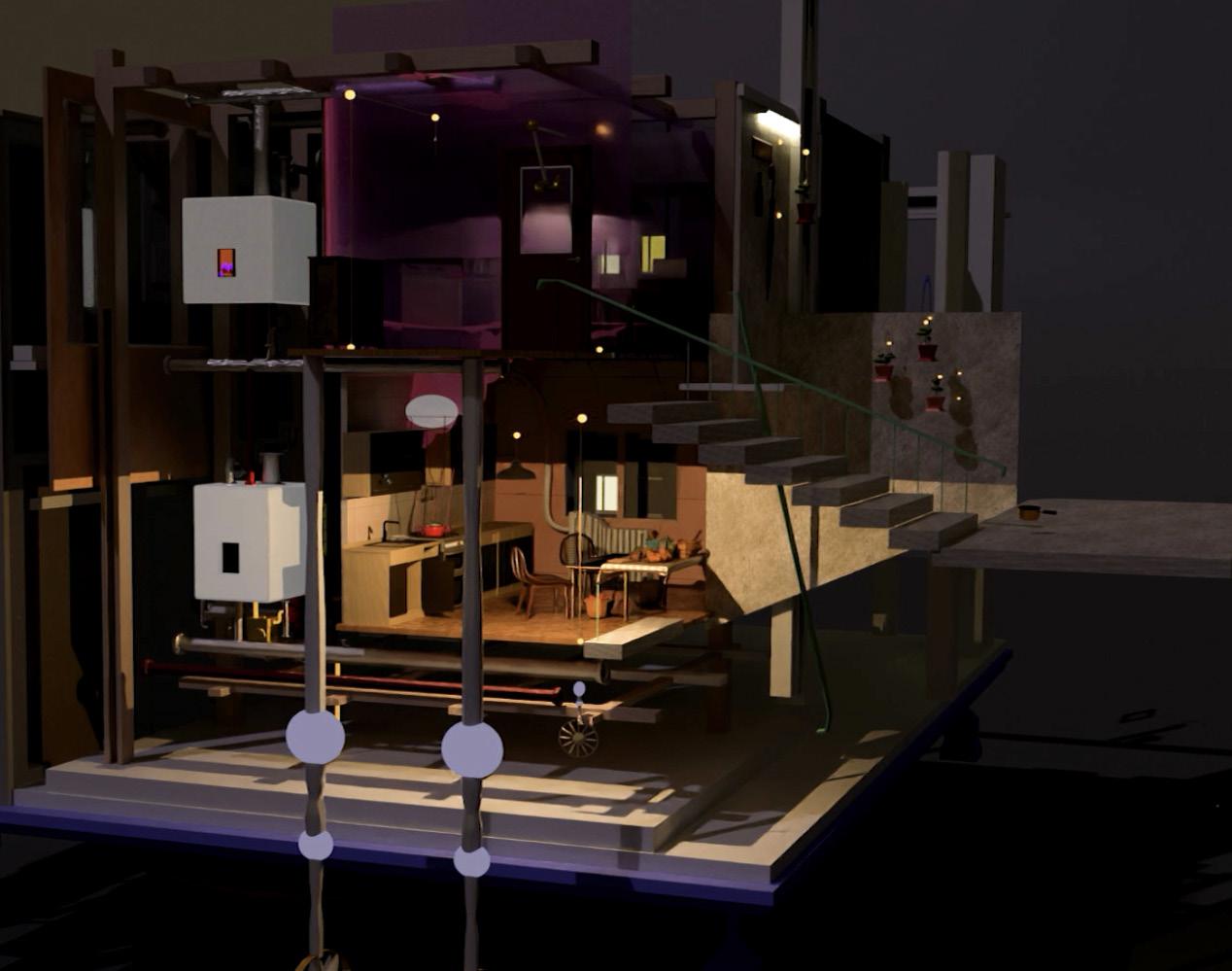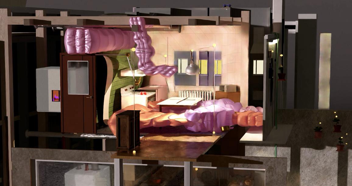The parallel flats: Design intervention within the kitchen, illustrated as a theatrical set.