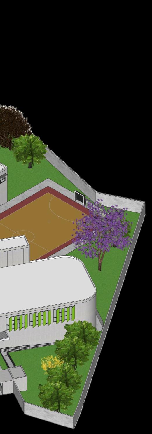 A solução proposta consistiu em dividir o edifício em 4 blocos, separados por pátios internos Essa divisão não apenas proporciona uma abundante luz natural às áreas de estudo, mas também oferece espaços externos protegidos do vento Nordeste, que traz consigo o odor característico do córrego localizado no parte posterior do terreno