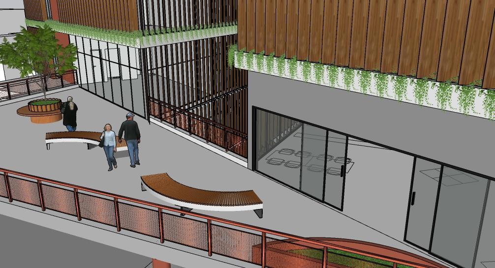 Numa tentativa de trazer fluidez ao entorno, o formato proposto é orgânico e quebra a rigidez dos grandes prédios, visto que seu formato remete às ondas do mar