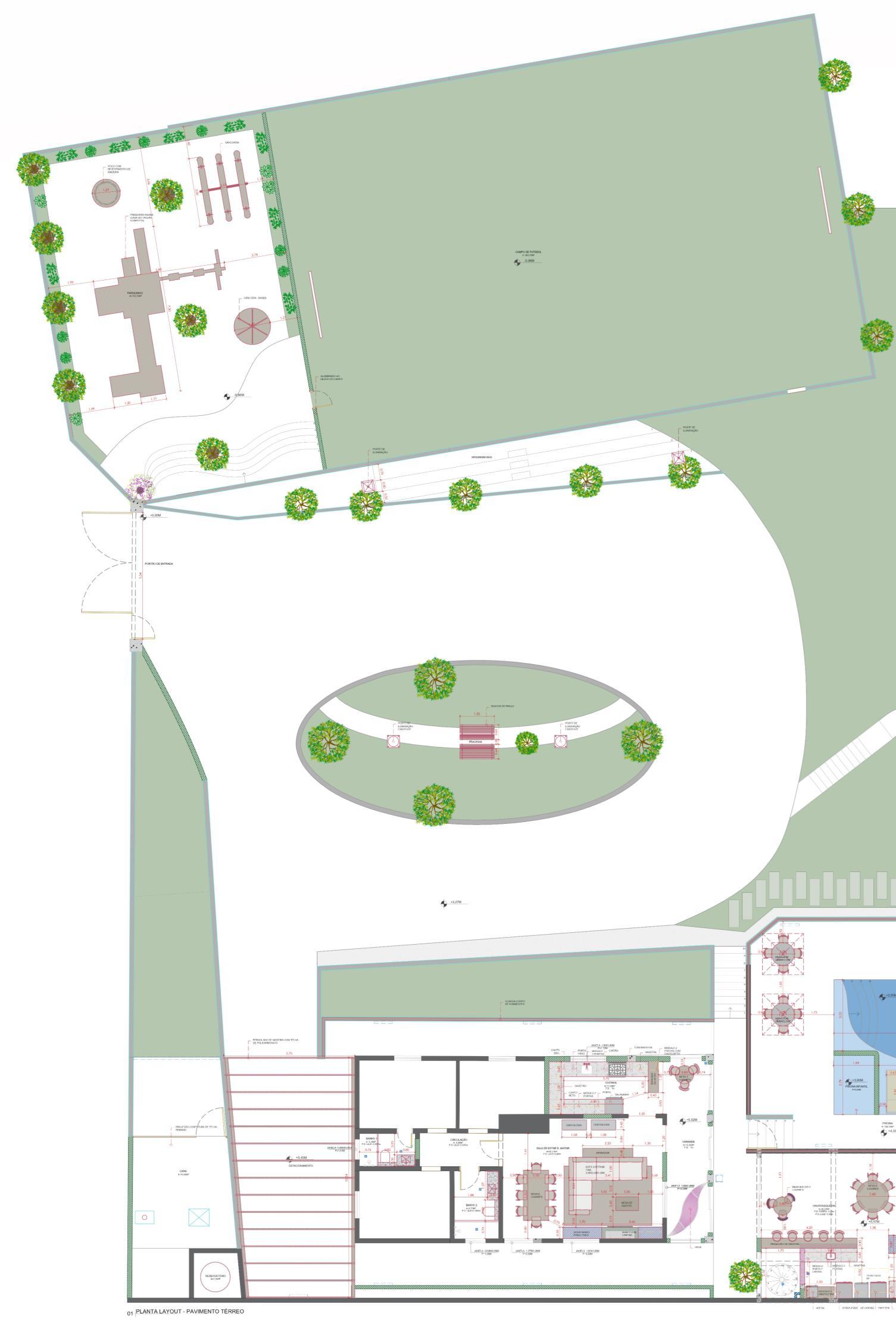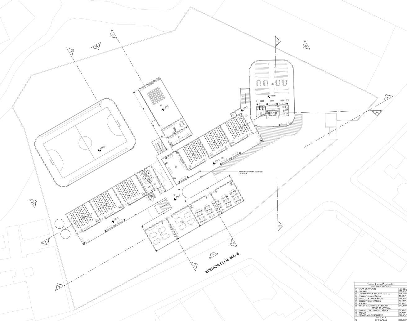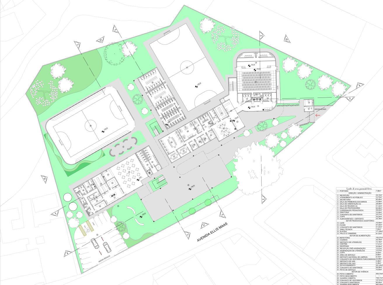 Seu programa contempla salas de aula, laboratórios, oficinas, refeitório, auditório, biblioteca e espaços de convívio