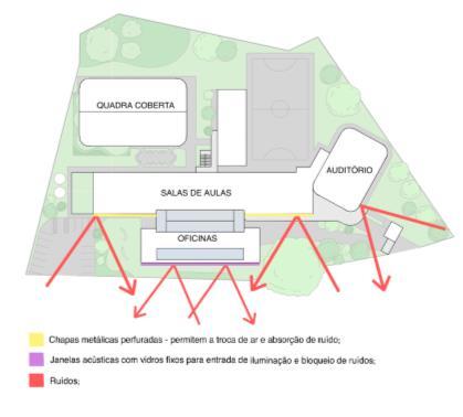 A implantação do edifício de forma angulada foi uma excelente alternativa para melhorar o conforto acústico do local, já que reduz a exposição direta às fontes de ruído