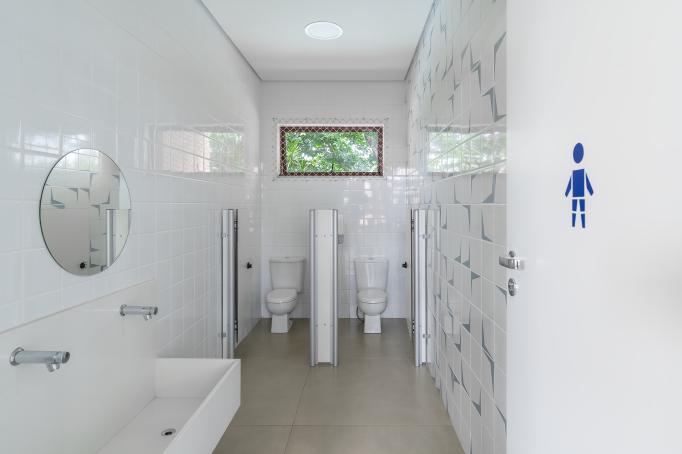 A solução adotada para atender o prazo disponível, foi a troca dos revestimentos das paredes, forro e piso, evitando a demolição de paredes. Para isso, optamos por revestimentos laváveis, considerando a manutenção necessária para manter os espaços escolares.