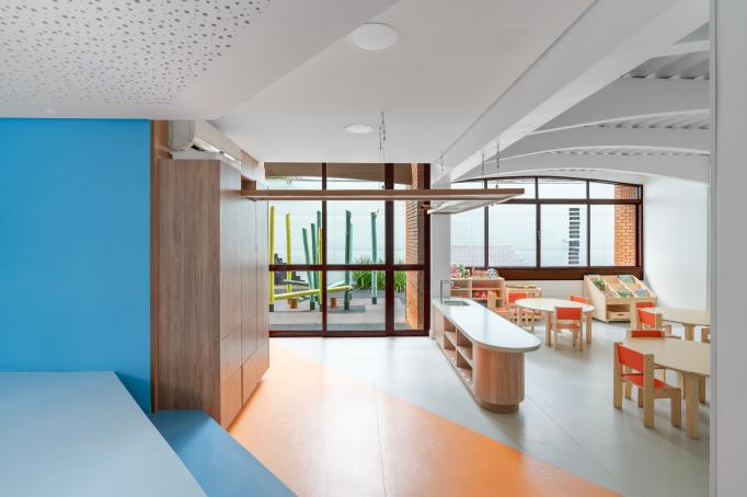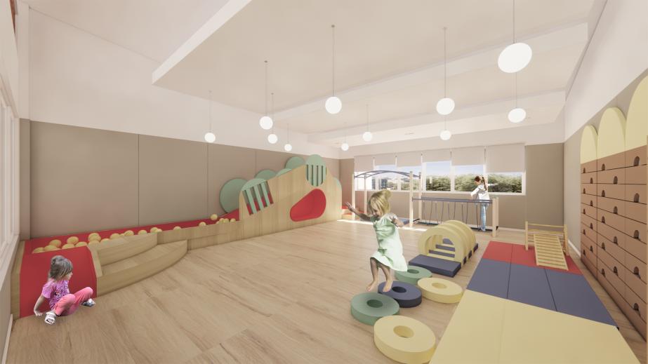 No programa acrescentamos uma sala multiuso, utilizada para a hora da soneca e para brincadeiras, acrescentamos uma sala de música e criamos também, um parque de brincadeiras, que permite as crianças fazem circuitos entre todos os brinquedos, estimulando a imaginação infantil.