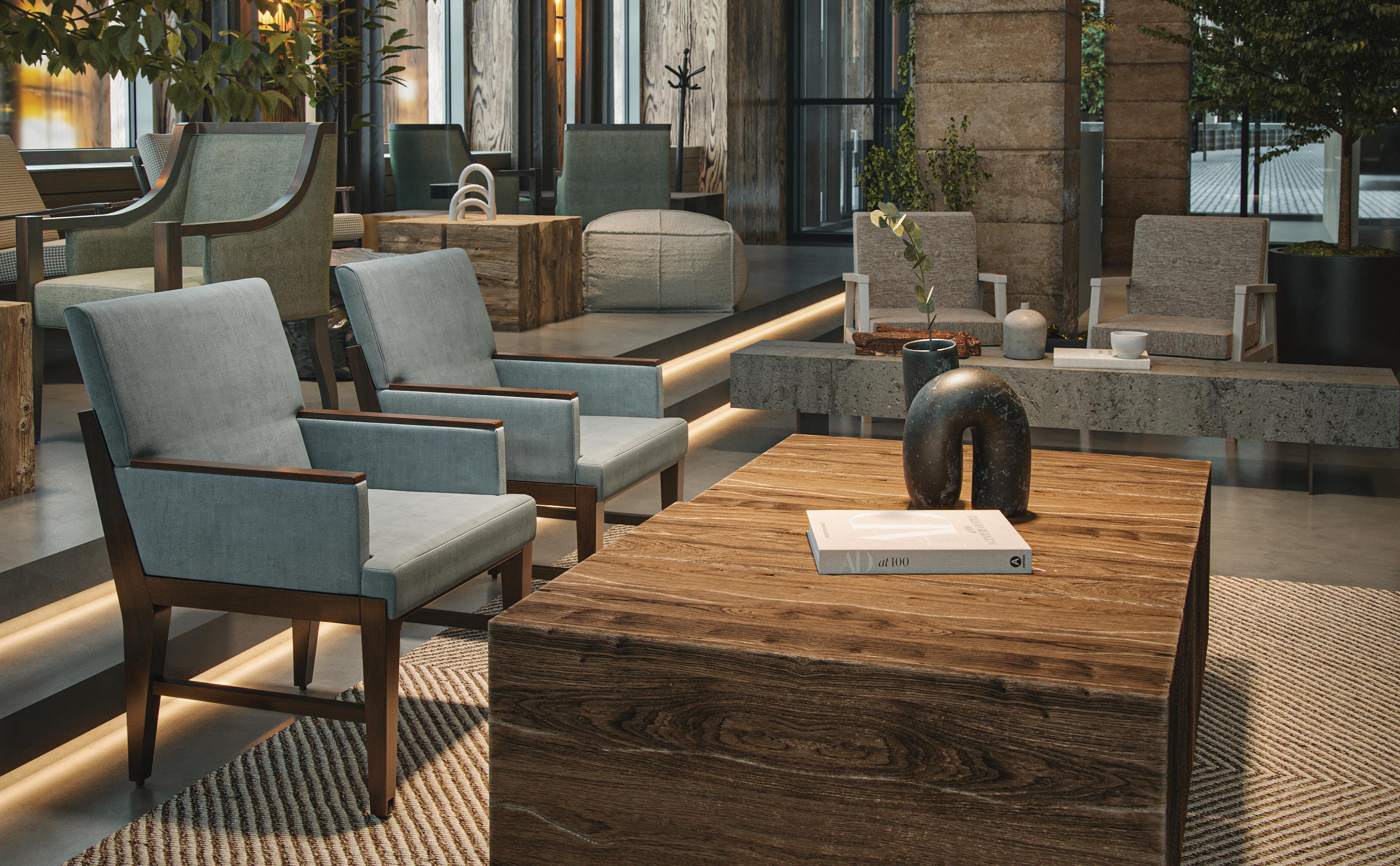 Along with style + sophistication, the Isaac Collection offers a deep, yet firm, seat that adds extra support for those in Senior Living communities. The wooden frame + legs offer substantial reinforcement + sustainability.