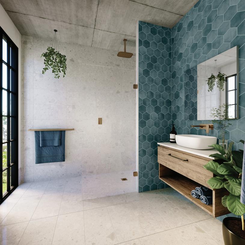 Featuring the Nuage tapware in a sleek Brushed Carbon finish and paired with the eco-conscious Sensi tile range, this design blends organic textures with an architectural elegance. The Sensi range, made from over 90% natural materials and up to 41% recycled content, delivers earthy tones and tactile surfaces, connecting your space to nature while embracing sustainability.