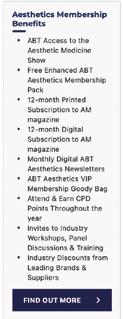 To celebrate the launch, we’re delighted to welcome both existing aesthetic practitioners and those considering expanding into the sector to visit us at the Aesthetic Medicine Show on Friday 8th and Saturday 9th May at Olympia London. You’ll find the ABT team on stand C11, ready to answer your questions in person. Visitors will also have the chance to earn CPD points, pick up a printed subscription to Aesthetic Medicine magazine and enjoy an exclusive ABT Aesthetics goody bag.