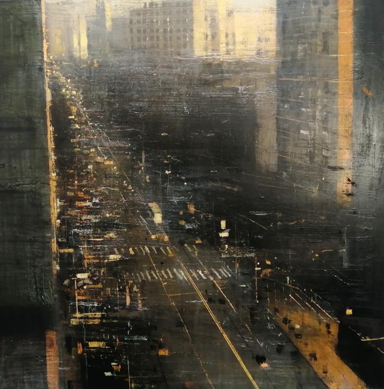 Alejandro Quincoces Luz de mañana en una calle de Nueva York óleo sobre tabla 85x85 cm