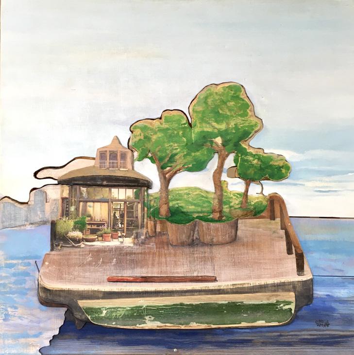 Bream cove óleo y collage sobre madera recuperada 40x40x3 cm