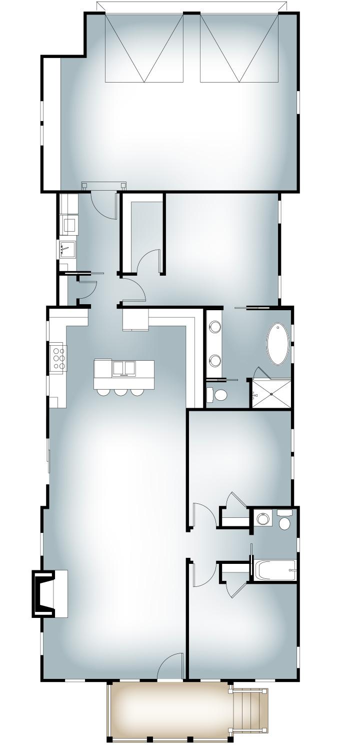 The Vickery is a larger floor plan, coming in at 2,228 square feet. The main level floorplan is similar to the Vinings, and features a larger main living area with the added benefit of a separate home office or study. On the upper level you’ll find two bedrooms and a full bathroom, as well as an optional 470 square foot bonus area that can be finished into a second Owner’s Suite with enough additional space for a true bonus room.