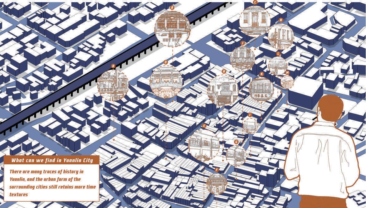 The spatial and temporal structure relationship of Yuanlin The distribution of the facades of the houses of the important historic streets and the important local centers of faith