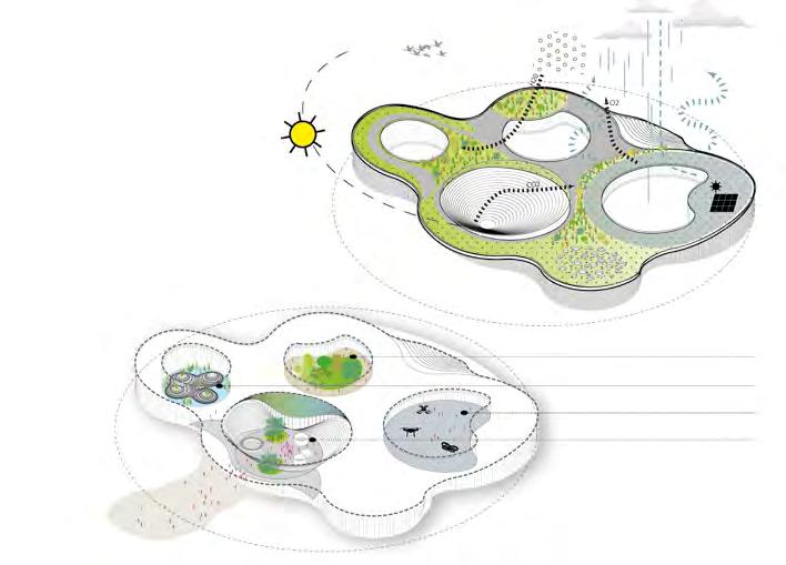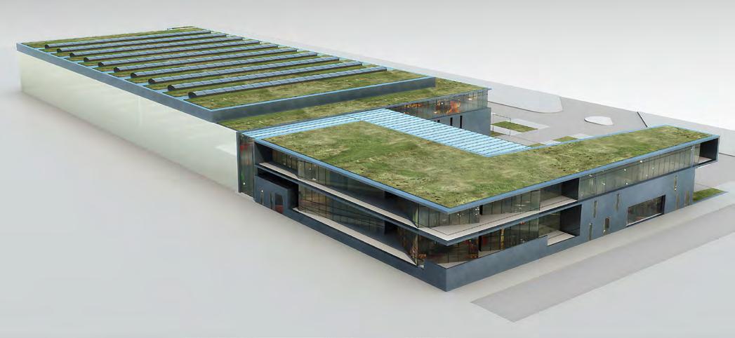 Beneath the “hill” slips a discreet hub of urban logistics. Seen from the sky, the whole is generously vegetated.