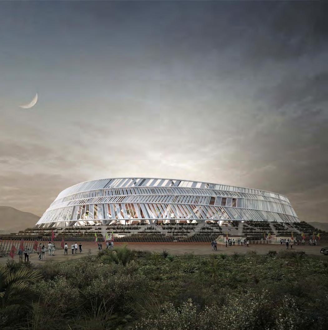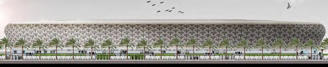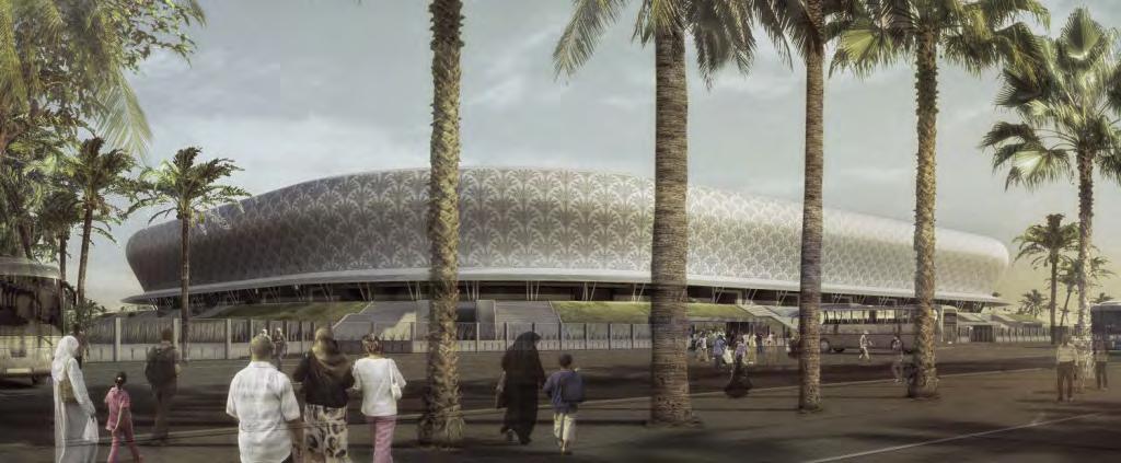 Designed in compliance with safety rules and FIFA standards, the stadium is sheltered by a chiseled aluminum shell that seems to float above the ground and whose patterns evoke the plant ornamentation of traditional Iraqi monuments.