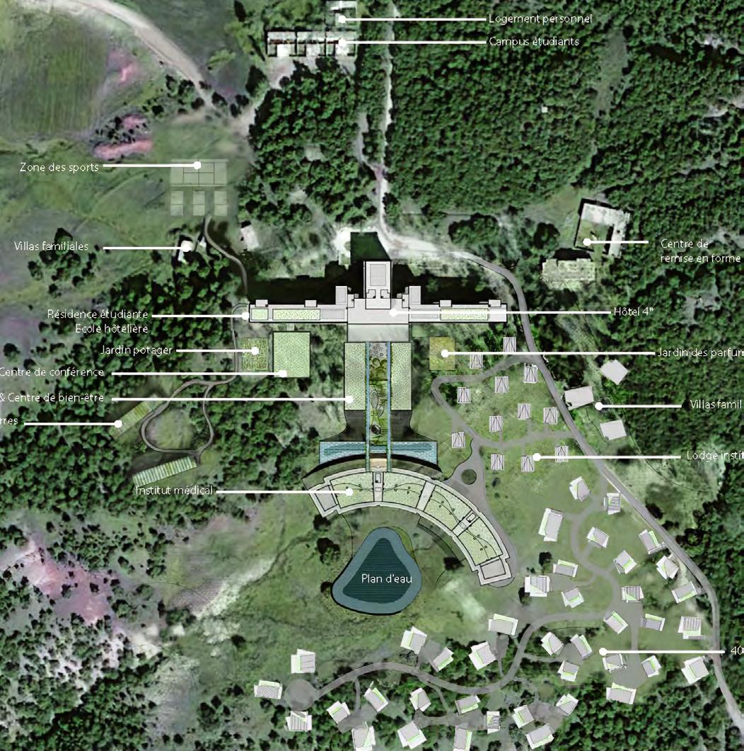 Pour réanchanter ce site délaissé nous avons conçu un complexe original que nous avons appelé “OUREA, Cité de la Santé, du Bien-être et de l’Environnement”. Il regroupe en effet sur le même site, un institut médico-chirurgical et de soins, de détente et de remise en forme, un centre unique d’enseignement, de recherche et de sensibilisation à l’environnement, une unité hôtelière de qualité avec son école.