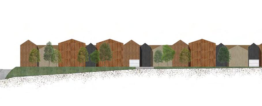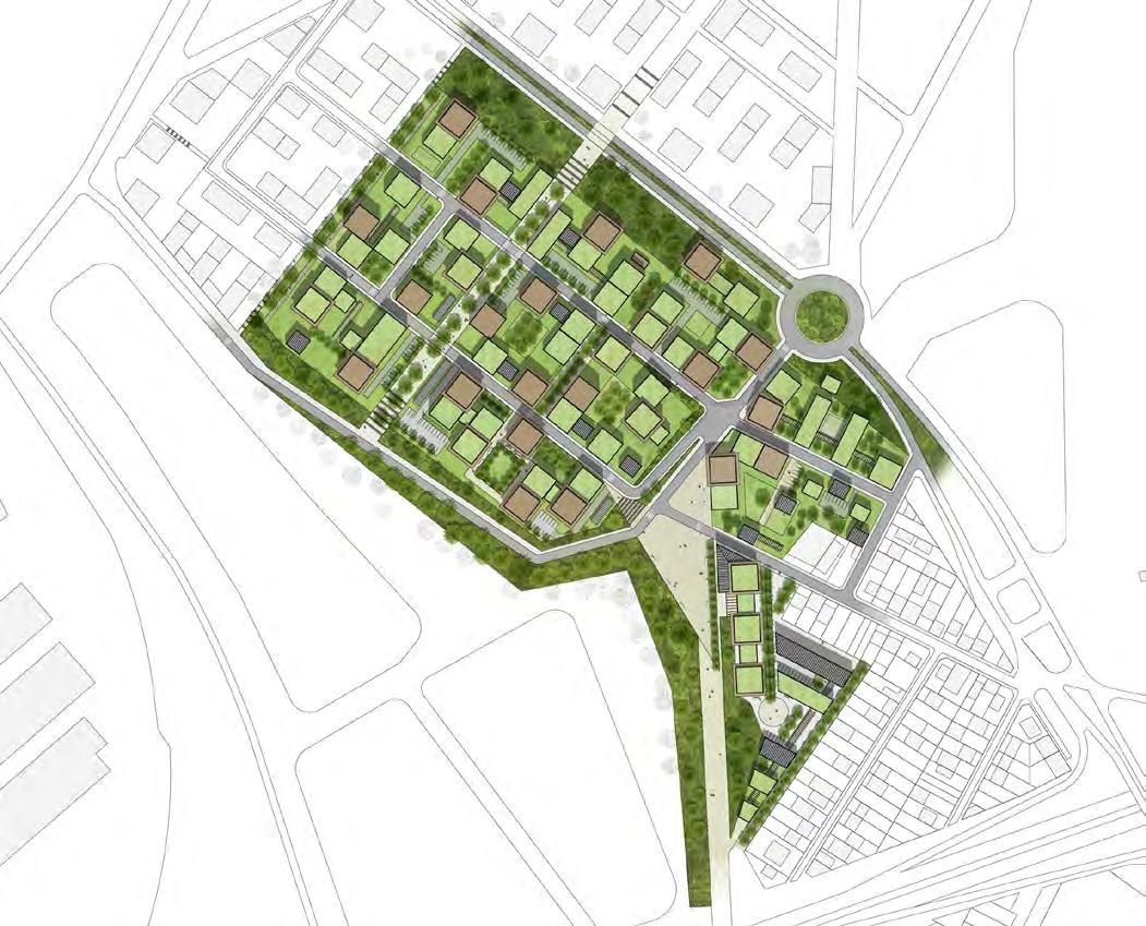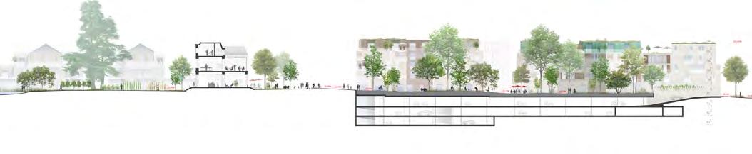 Recoudre l’espace urbain, S’hybrider au territoire, Jouer avec la topographie du site La parcelle est située sur un talus est aujourd’hui occupé par un entrepôt logistique monolithe qui s’impose dans le paysage, en redessinant le talus, pour le transformer en « colline habitée », la parcelle devient l’un des « greffons » du renouvellement de son écosystème. Elle participe ainsi à la requalification des voieries du quartier, à son apaisement, à sa transformation par l’installation notamment d’une nouvelle centralité, au pied de l’arrivée de la passerelle.