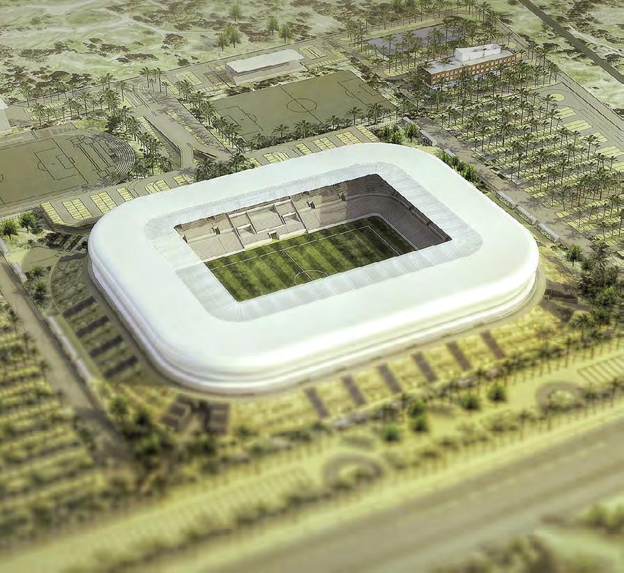 Situé à la sortie de Nasiriyah au sud de l’Irak, sur la route de Bagdad, le projet décline un stade de 30 000 places, 2 stades d’entrainement de 2 500 et 500 places et un hôtel 4* de 80 chambres.