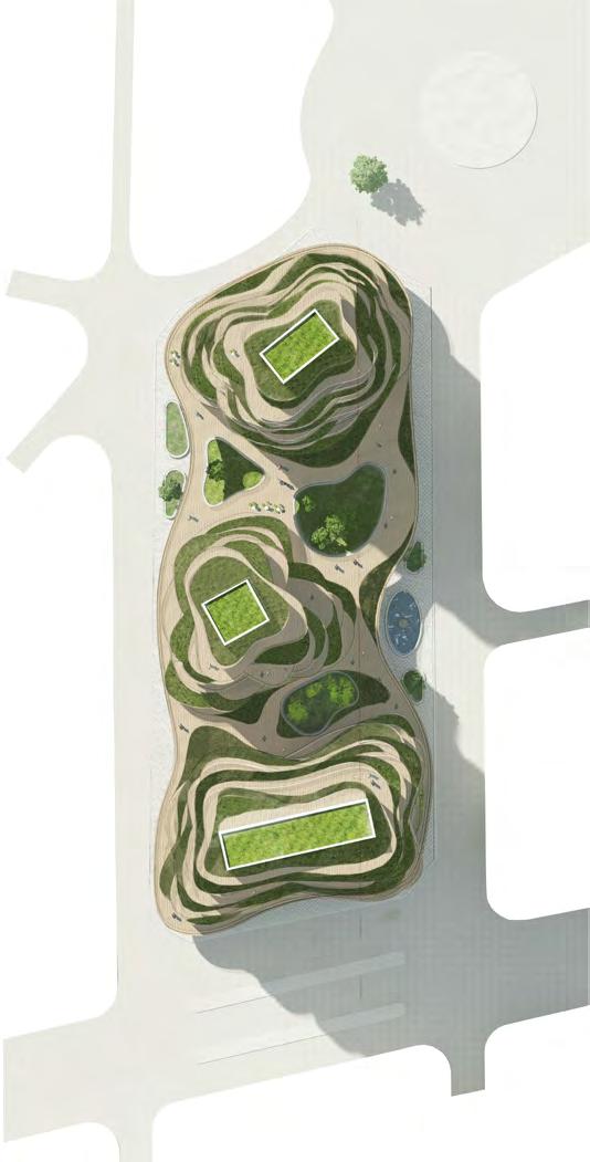 Stitching up the urban space, Hybridizing with the territory, Playing with the topography of the site The plot is located on an embankment and is now occupied by a monolithic logistics warehouse which stands out in the landscape, by redrawing the embankment, for the transformed into an “inhabited hill”, the plot becomes one of the “grafts” of the renewal of its ecosystem. It thus contributes to the requalification of the roads of the district, to its appeasement, to its transformation by the installation in particular of a new centrality, at the foot of the arrival of the footbridge.