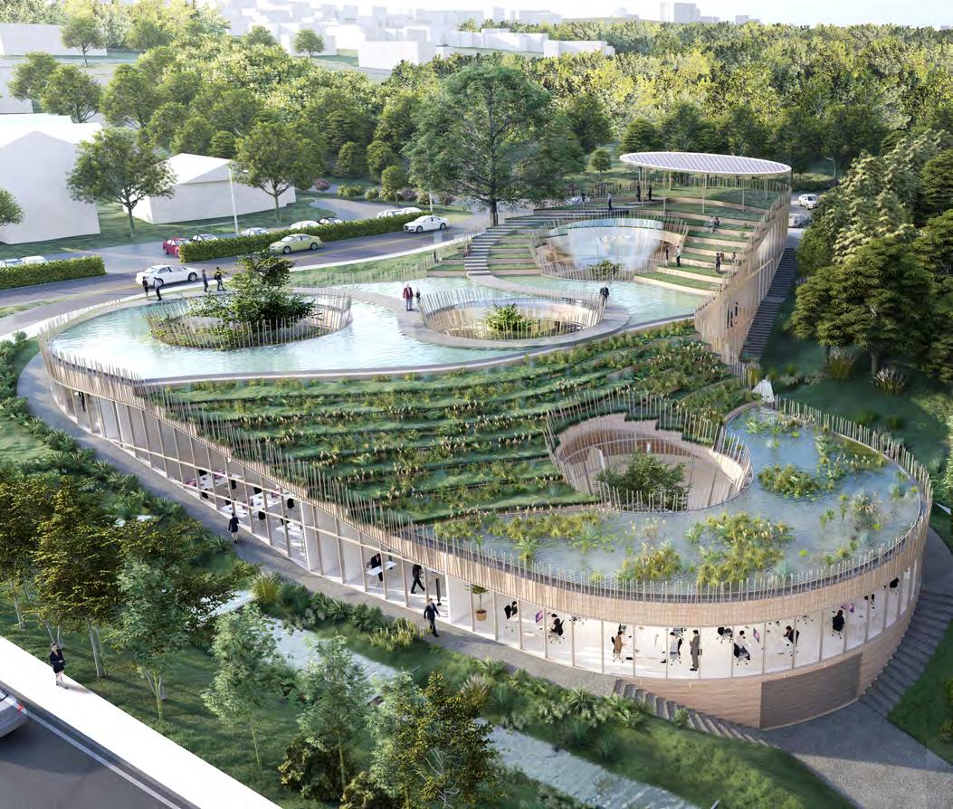 - Respectueux de son environnement qui expose des caractéristiques plus urbaines compatibles avec la présence voisine de logements, - Un projet mutable et flexible dans le temps, - Un projet qui accompagne les enjeux liés au changement climatique : biodiversité positive, économies circulaires, matériaux biosourcés,…