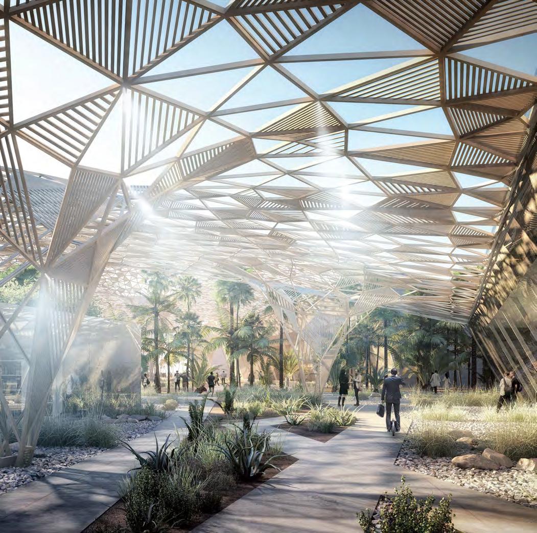 Notre démarche s’appuie sur le potentiel et les atouts du site situé en plein milieu de l’Oued en optimisant le dialogue entre le bâti et son environnement. Nous nous servons du climat, des vents, du sable, et des savoir-faire du littoral subsaharien, pour atteindre les meilleures performances durables. Des tentes végétalisées, mi-tentes/mi-dunes, sous lesquelles on vient glisser les bâtiments, tissent le paysage. Suivant les lignes des dunes du désert, la rue intérieure est ses transversales sont une allégorie aux terres craquelées de l’oued. Couvertes d’une canopée, elles laissent une place importante à la nature et créent des espaces de rencontres et d’échanges entre les hommes.