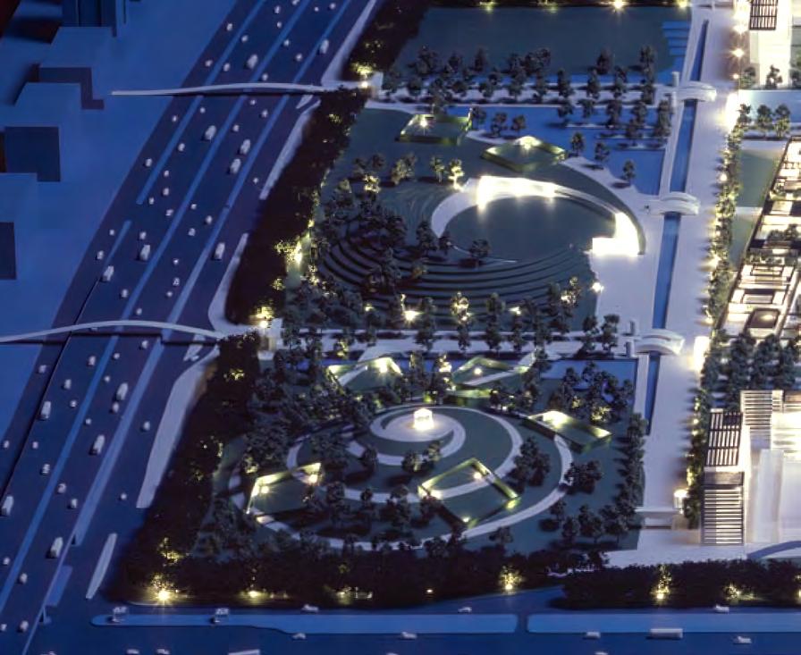 Embodying one of the nine Chinese provinces, each of the gardens of the nine plots plays in a different register (bamboo grove, playground, hill planted with pines, etc.) while water in all its states and effects (reservoirs, fishing pond, fountain, aquarium , swimming pool or liquid walls…) serves as a common thread throughout. The response to this international competition gave importance to the ecological and environmental dimension of this urban park of the future, reconciling Mandarin culture and high technology.