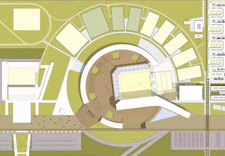 Le concept du futur complexe équestre emprunte son tracé géométrique à l’anneau olympique qu’une diagonale vient scinder en deux entités distinctes. Sa moitié occidentale concentre de façon rayonnante l’ensemble des équipements du programme réservésaux équipes et chevaux participant aux Jeux: clinique vétérinaire, écuries, manège, hébergementdes lads, locaux de services, aires d’entraînement et de stationnement. La seconde, à l’est, accueille le public depuis ses parkings paysagers par une avenue ornée de statues équestres qui distribue impérialement les tribunes des deux arènes. La plus petite de cellesci, préexistante, restaurée et destinée au dressage car plus intimiste, reçoit une voilure formant toiture et façade dont la silhouette réinterprète l’étalon cabré du pictogramme mandarin.