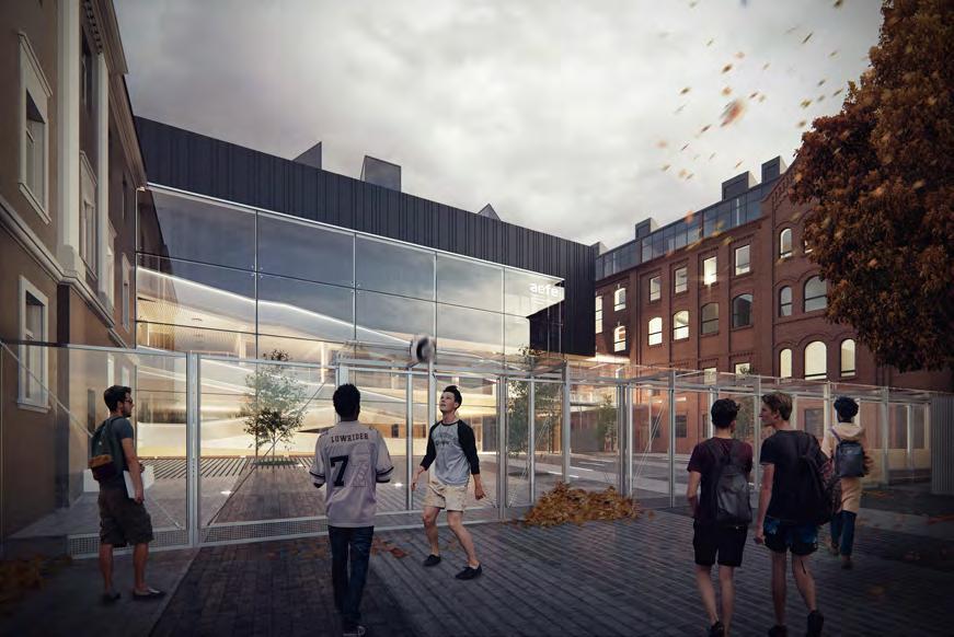 Pour matérialiser cette idée forte, notre projet propose une extension résolument contemporaine avec un grand hall vitré et transparent, dans lequel les dynamiques sont données par les échanges et les circulations des élèves. Il laisse percevoir un lieu d’échanges en mouvement constant, ouvert sur la ville, et qui symbolise ainsi un système éducatif en marche, qui fait le lien entre l’histoire et l’avenir des générations futures