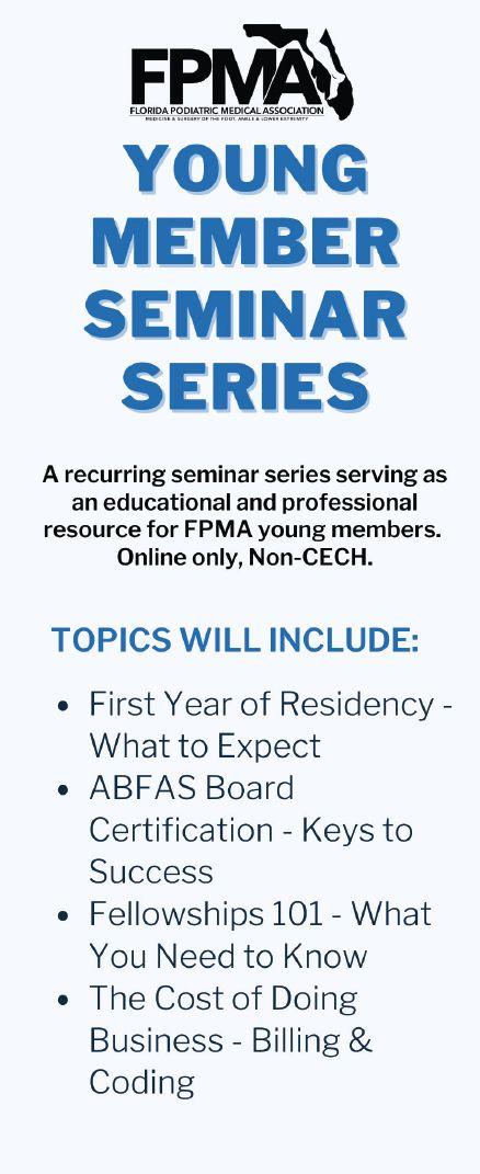 The popular FPMA Young Member Seminar Series is a recurring seminar series designed to serve as an educational and professional resource for FPMA young members. FPMA recognizes our young members as the future of the podiatric profession and wishes to provide the tools and resources necessary for success now and throughout young members’ podiatric careers.