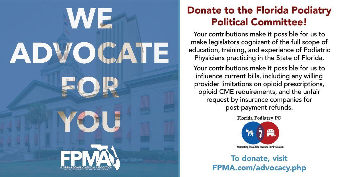 Giving back to your profession is imperative. This may include allowing a prospective student to shadow you in your office, volunteering with Special Olympics, speaking at a conference and/or participating on an FPMA committee. Making meaningful contributions to both Florida Podiatry PC and APMAPAC allows designated representatives to advocate for podiatry by meeting with government officials on both the state and federal levels. In addition, podiatric physicians can access advocacy resources on both the FPMA and APMA websites to contact their individual state and federal officials to educate them on any current issues or concerns pertaining to the profession.