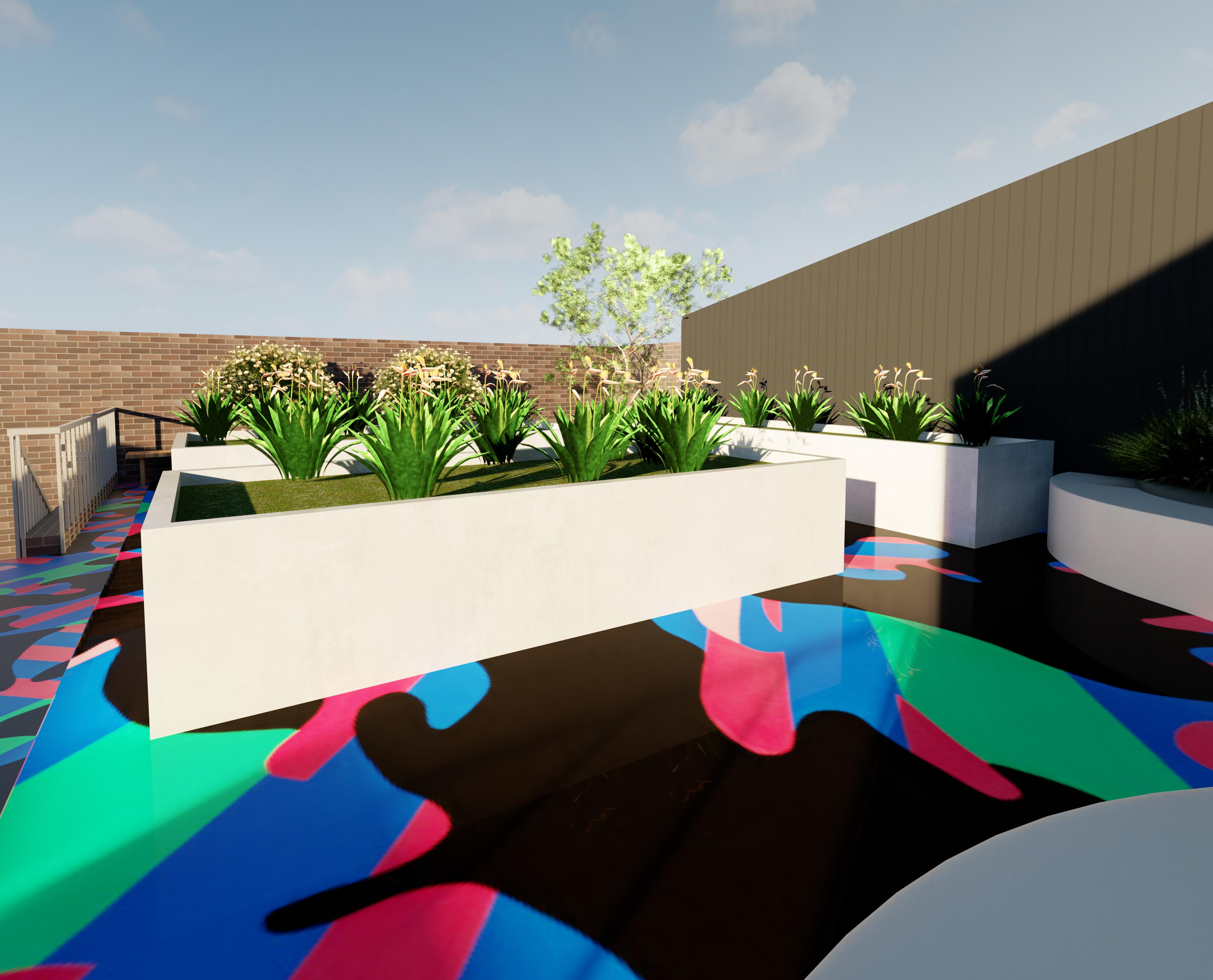 A vibrant rooftop community garden and cafe, with featured street art by Reko Rennie and space for art installations that reflects the inner west community.