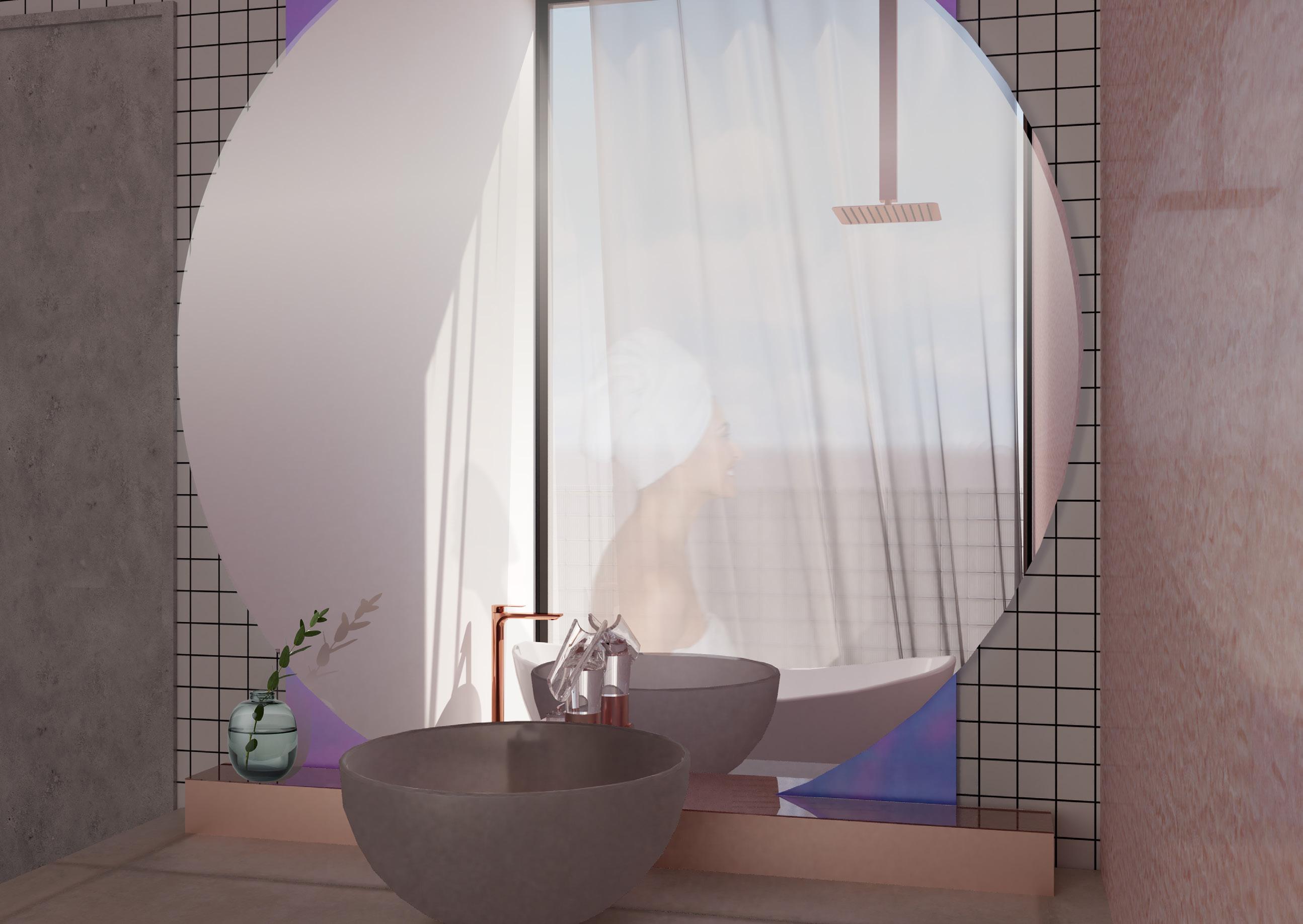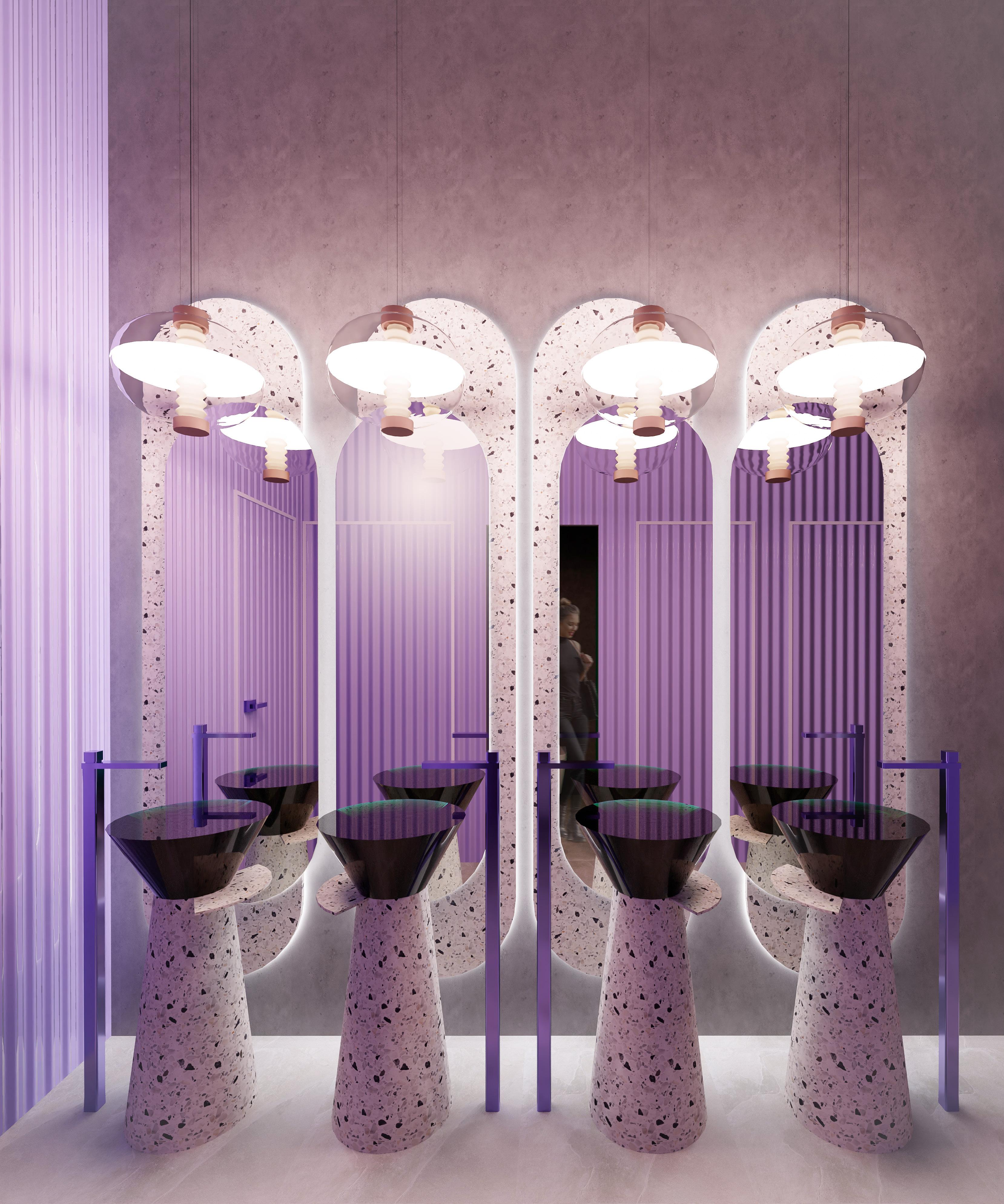 The design has been inspired by the form and materiality of scientific equipment. Using fluid shapes, translucency and mirror as a foundation for the many custom elements of the space .