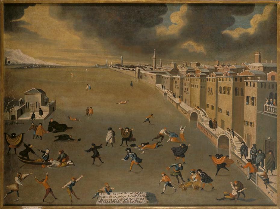 ↑ One of the coldest winters in Europe in the last five hundred years was the winter of 1708/1709. An anonymous Venetian painter immortalized it in the painting Frozen Lagoon at the Fondamente Nuove in 1708, 1709. Fondazione Querini Stampalia, Venice.