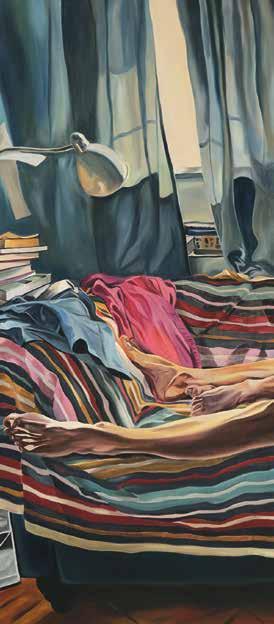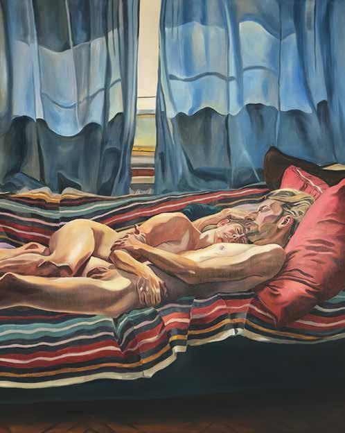 kłębione tkaniny i ciała. W uścisku, miękkie i dociążone uczuciami. to od nich, od ich gęstości i temperatury, wszystko zaczyna falować, rozpływać się i powracać –intensywnie, bezpośrednio, bez niedomówień. obrazy składające się na wystawę Moja dziewczyna jest dziewczyną mojego przyjaciela są, jak zwykle u Patryka r óżyckiego, aktualne, osobiste, przejmująco szczere i dosłowne. Nie ma tu ukrywania się za warstwami kotłujących się materiałów. jest natomiast leżenie nago na pierwszym planie. Przyznawanie się do słabości i bezbronności. Wyznawanie potrzeby bliskości. okazywanie czułości w małych, codziennych gestach. Zatracanie się w odbiciu twarzy ukochanej osoby w lusterku do makijażu. Nieustanne zanurzanie się w uczuciach, ich odtwarzanie, rozdrabnianie, zwielokrotnianie – byle trwały. A trwają długo, pielęgnowane przez trzy osoby współdzielące dom, pasje, czas i siebie nawzajem. Wystawa odkrywa opowieść o byciu razem – przyjemnym, ciepłym, opartym na zaufaniu, komunikacji, nieparzystym.