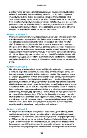 proste pytanie, bo wagon dla kobiet sugeruje, że hej, jesteśmy rzut beretem od Arabii Saudyjskiej, ale my tu dbamy o komfort kobiet, helou, to prawie #Skandynawia, tylko że jest piaseczek, a z drugiej strony dlaczego tylko 20% składu to wagony dla kobiet, a nie 50%? Dowiedziałam się też, że gdybym chciała w tym pustym metrze położyć się na fotelach, płacę pięć stówek, gdybym chciała pić – tylko stówkę. Za to za nogi na siedzeniu – do tysiaka, a za przyklejanie gumy do foteli – prace społeczne. Ciekawe jakie. Zdrapywanie gum szczoteczką do zębów i octem – to obstawiam. #witamy_w_al-hajsik 7 Dobra, miałam się nie chwalić, ale jako regular, a nie wcale jakiś design director, mieszkam w pracowniczym Hiltonie. To jest prawda autentyczna – istnieje coś pomiędzy komunistycznym hotelem robotniczym a hotelem typu fąfi-fąfi. Polega to na tym, że mam jakiś ultra materac king size bed z kokosem i bóg wie jakim lateksem, który zajmuje pół mojego luksusowego mieszkanka, w którym jak się rozbierałam, to musiałam torebkę wstawić do zlewu. Zupełnie jak w moim mikromieszkaniu w Paryżu, w którym w łazience albo byłam ja, albo drzwi. I jaram się opór, bo mieszkam podobno 100 m od plaży i mam taki śniadaniowy wypas, jak w Hiltonie takim normalnym, bo stołówka robotnicza wygląda tu jak knajpy, w których w Warszawie musiałabym raczej zostawić pół pensji. #witamy_w_al-hajsik 8 Nie wiem, czy to jetlag daje mi się we znaki jak nigdy dotąd, czy cisza rodem z filmów o zagładzie nuklearnej. W nocy, kiedy przyklejam się do szyby, szukam wzrokiem na dole Willa Smitha tropiącego zombie. Dlaczego było pusto na ulicach, gdy jechałam metrem z lotniska? Bo tu po 23 indywidualny ruch kołowy jest zabroniony. Jeżdżą tylko taksówki i metro z lotniska. Gasną światła jak w Harrym Potterze. Po chuj, zapytam? Bo o szóstej nad ranem nagle samochody tak kurwa zaczynają ryczeć, jakby chciały rozwalić całą tę uroczą wyspę w kształcie delfina (to nie żart, #Al-Hajsik to chyba drobny faczek w stronę Dubaju – cała sztuczna wyspa ma kształt delfina, a ja mieszkam na jego płetwie grzbietowej). No i se ryczą, a potem 23 i koniec. Metro nie wydaje dźwięku. Ulice czarne. Ciężko dostrzec tego Willa Smitha. Oglądając z okna na czterdziestym piętrze ciszę i ciemność, czuję się jak w #SpaceOdyssey #Kubricka. A czemu tak rano ryczą jak zarzynane bawoły te samochody i czemu noc jest jak makiem zasiał? Bo tu dzień pracy, tej biurowej też, trwa dwanaście godzin. A gdzieniegdzie zdarzają się i nadgodzinki, mili państwo. #witamy_w_al-hajsik 9 W nocy widać z okna tylko jedną rzecz – oko Saurona, port lotniczy, który znajduje się, patrząc na plan wyspy, dokładnie w miejscu, w którym powinno znajdować się oko delfina. Jest wielkie i wyłupiaste i rozgląda się Boeingami 787 na cały świat, nic mu nie umknie. Podobno Emirates już liczy straty. Psie Łajka, i ty to widzisz i się nie śmiejesz? Myślę, że Łajka płacze z rozbawienia kosmicznymi łzami. Mi jest trochę mniej śmiesznie, bo jedyny jasny punkt na horyzoncie widzę dopiero gdy się bardzo mocno przytulę do ściany. Głównie 108