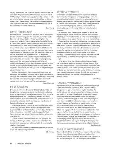 reading. He informed The Ousel that his favourite books are The Lord of the Rings and Game of Thrones; so if you are in one of Mr Midwinter’s maths lessons, you better behave before he tells you which character is going to die next (thankfully, he did not reveal it in our conversation). We hope he continues to lead the Colts rugby team into more successful battles and wish him all the best for his time here at Bedford! Calvin Fang