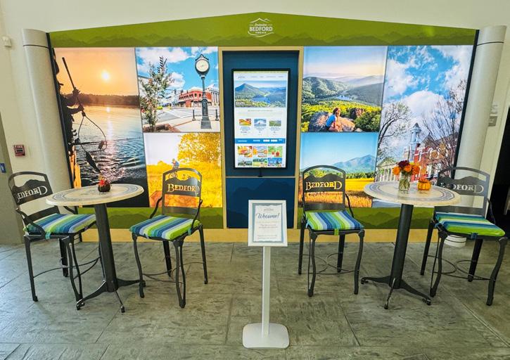 Improvements include a large photo wall that can be changed seasonally (top right), a visitor courtesy desk, a Blue Ridge Parkway sitting nook, kiosk to navigate the Destination Bedford website (bottom left), and other large graphic and photography displays.