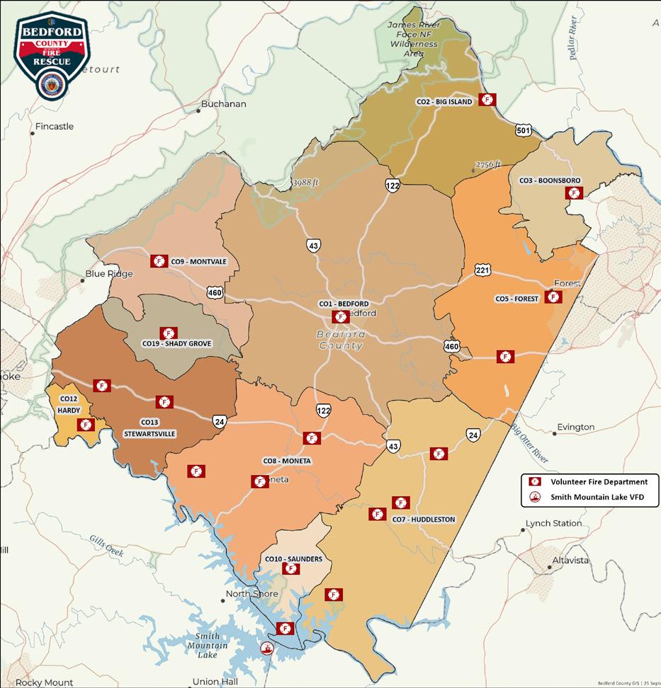 Fire & Rescue services are delivered by both career and volunteer personnel from numerous locations across Bedford County.