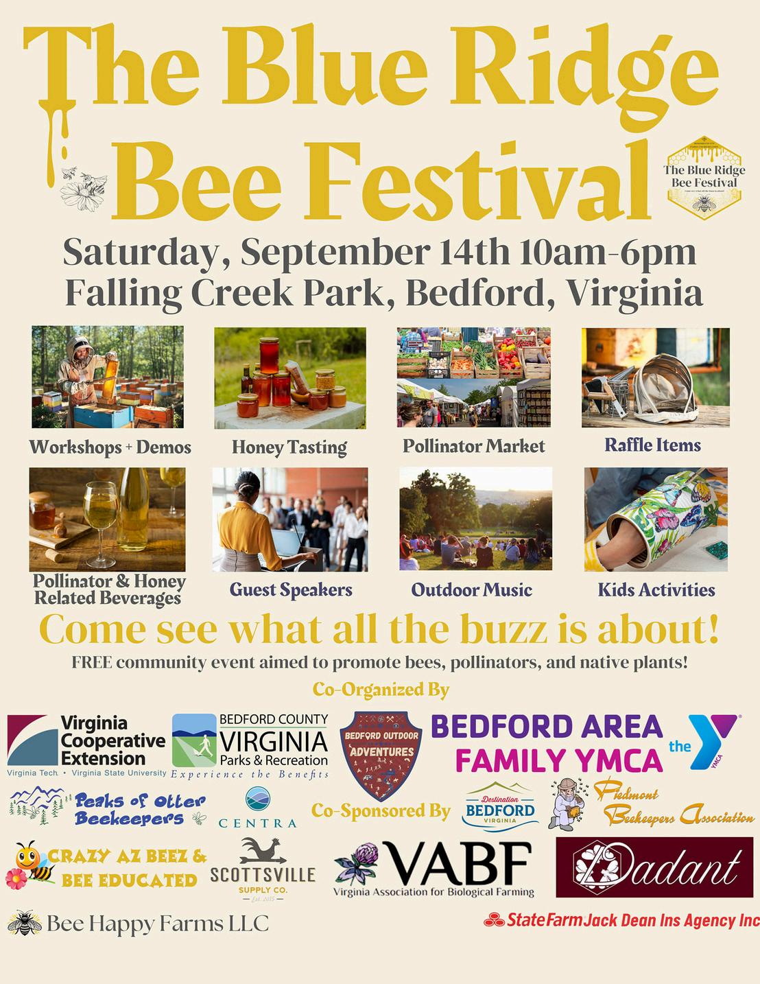 The Blue Ridge Bee Festival is a FREE community event aimed to promote all things bees in the Blue Ridge region along with all pollinators in the Piedmont! Festival includes workshops and demos, guest speakers, honey tasting, pollinator market, kids activities, food trucks, outdoor music, raffle items and more!