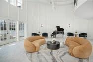 he three-car garage that’s walkin to a huge mudroom has been retrofitted with lifts - so that this garage accommodates a total of six cars. In addition, there’s a structural driveway leading from the house into the backyard that’s under the lawn, and another garage in the backyard - in the same modern, stone, wood and glass style as the separate pool house, and with homage to the mid-century modern masterpieces in the backyards on either side of the property - and that two-car space, with a glass front door that makes the cars inside visible from the house, has underground elevators in each bay, so that garage can house four more cars…or make for a great party space!