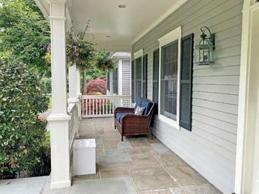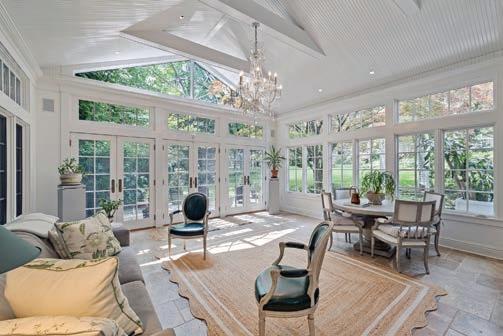 The outdoor spaces are just as much a part of the home and living space as the inside. A gorgeous covered back porch with picturesque rocking chairs boasts reservoir views; a completely windowed room with a hanging swing porch chair serves as an indoor-outdoor living room; and; the yard was turned into a sublime recreation space with a Har-Tru tennis court and pool connected by a patio.