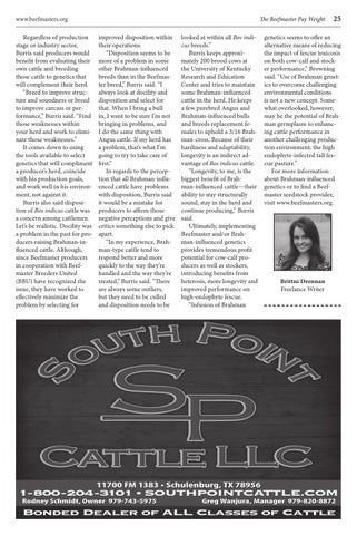 improved disposition within their operations. “Disposition seems to be more of a problem in some other Brahman-influenced breeds than in the Beefmaster breed,” Burris said. “I always look at docility and disposition and select for that. When I bring a bull in, I want to be sure I’m not bringing in problems, and I do the same thing with Angus cattle. If my herd has a problem, that’s what I’m going to try to take care of first.” In regards to the perception that all Brahman-influenced cattle have problems with disposition, Burris said it would be a mistake for producers to affirm those negative perceptions and give critics something else to pick apart. “In my experience, Brahman-type cattle tend to respond better and more quickly to the way they’re handled and the way they’re treated,” Burris said. “There are always some outliers, but they need to be culled and disposition needs to be