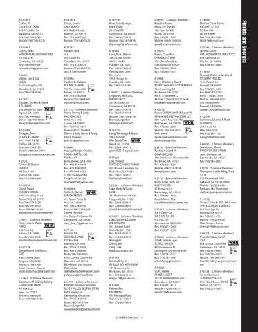 A 6468 Daniel, Lee & Gail LEGAL 1524 Rising Sun Rd Woodland, GA 31836 Res: 706/674-2614 A 32622 Dougan, Dr. Ken & Diana K D FARMS 290 Vinson Rd. N.W. Tignall, GA 30668 Res: 706/990-8603 Other: 706/990-9956 dougandiana@yahoo.com A 101066 Douglas, Don DOUGLAS FARMS 3011 River Rd NE Dalton, GA 30721 Res: 706/259-3723 Mobile: 706/260-7572 douglas3011@windstream.net A 2524 Farmer, B. Wayne FARMER PO Box 1149 Oxford, GA 30054 Res: 770/786-6469 A 100274 Flood, David FLOOD’S FARMS 3958 Standing Road Tunnel Hill, GA 30755 Res: 706/673-6339 Bus: 706/537-3633 Rnch: 706/673-6339 davidflood@windstream.net L 7674 (Lifetime Member) Ford, Ernie & Marie FORD 926 Ford Rd Edison, GA 39846 Res: 229/835-2873 erniefordfarms@windstream.net A 101724 Getta Round Tuit Ranch GRT 4941 Crowe Drive Smyrna, GA 30082 Res: 678/794-5306 Scott Dodson - Owner scott.dodson@cobbcounty.org L 12845 (Lifetime Member) Grantham M D, Greg & Vicky GRANTHAM FARM PO Box 352 Gray, GA 31032 Res: 478/986-6030 Rnch: 478/986-6030